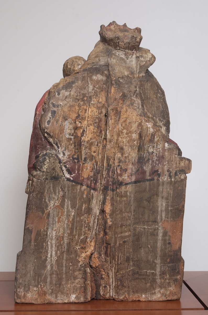 "La sculpture affirme d'emblée son origine haut-rhénane, à la fois par son type iconographique, sa conception formelle et ses caractères stylistiques. La Vierge est assise de face sur un banc, tenant l'Enfant Jésus nu, en position instable sur l'un de ses genoux drapés dans un grand pan de manteau qui traîne sur le sol. [...] Loin d'être statique, la pose frontale de la Vierge s'anime par le mouvement des bras et du drapé, par l'attitude mobile de l'Enfant. La composition s'articule dans l'espace et se saisit dans les vues de trois-quart comme dans la vision de face. L'organisation du drapé est typiquement haut-rhénane par la façon dont le vaste manteau se déploie et enveloppe le bas du corps en formant des plis artificiellement brisés, des arêtes anguleuses et des creux profonds, par le jeu des longues courbes en bordure du vêtement dont les pans s'étalent au sol. Le visage de la Vierge, l'allure vive et le corps potelé de son Fils évoquent aussi des exemples du Rhin supérieur. L'ovale allongé du visage féminin, le volume arrondi des joues très pleines et du double menton, le renflement des paupières supérieures, le nez long et mince, sont parmi les traits caractéristiques d'un type physique favori des sculpteurs strasbourgeois depuis les créations de Nicolas de Leyde et ses émules." (cat. expo Figures de madones. Vierges sculptées des Vosges XII- XVIe siècle, Epinal, 2005)