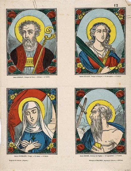Saint GERMAIN, Evêque de Paris. - 28 mai. - VIe siècle. / Sainte EULALIE, Vierge et Martyre. - 10 décembre. - IVe siècle. / Sainte EUPHRASIE, Vierge. - 13 mars. - IVe siècle. / Saint JEROME, Docteur de l'Eglise. - 30 septembre. - Ve siècle. 12. (titre inscrit)