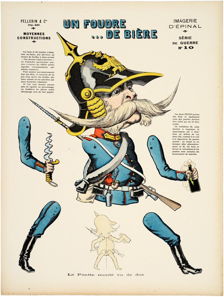 jeu de papiers (pantin) ; figure (satirique, exagération, effet de mouvement ; Guillaume Ier de Prusse : roi de Prusse, uniforme, soldat : Allemagne, casque à pointe, bouteille, couteau : tire-bouchon, fusil, baïonnette)