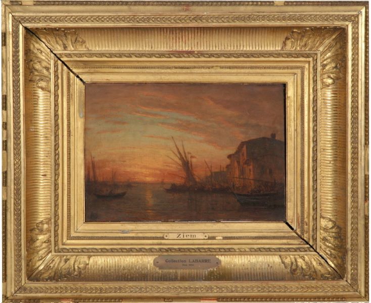 Au soleil couchant, vue d’un port sans caractéristique précise (architectures méditerranéennes). Des bateaux sont accostés, d’autres arrivent. Les voiles sont pliées ou en train de l’être.