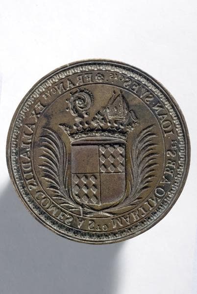 matrice de sceau de François d'Alliez (ou de Aylé), comte de Saint-Martin, abbé de Saint-Jean-des-Vignes de Soissons ; ronde à douille, manche disparu ; inscription et représentation en creux ; Arch. nat. st 8145