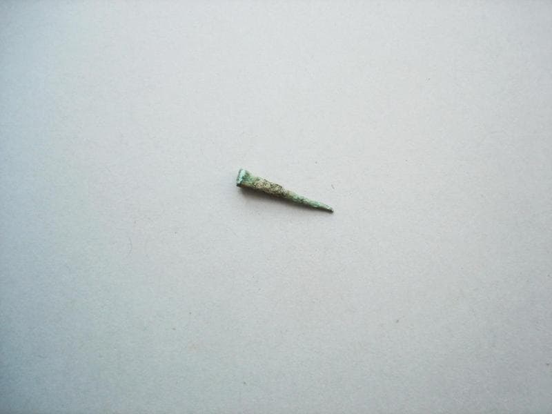 petit clou à tête plate peu marquée ; la tige est de section quadrangulaire au départ de la tête et passe progressivement à une section circulaire vers la pointe (DEBORD, 1998)