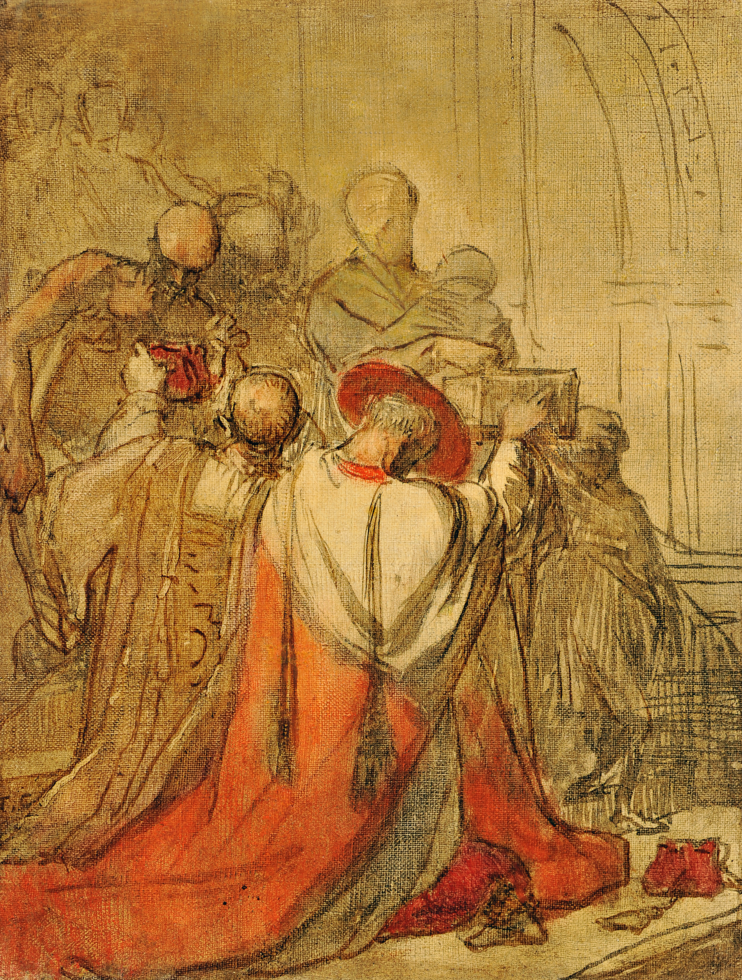 Le spécialiste américain de Thomas Couture, Albert Boime ne fit pas état de cette oeuvre dans la monographie qu'il consacra à l'artiste en 1980. Il s'agit pourtant du Denier de Saint-Pierre, dont la dernière apparition publique remonte à 1880, lors de l'exposition rétrospective consacrée à Thomas Couture au palais de l'Industrie de Paris. Au n° 87 du catalogue, ce tableau était décrit comme une ' esquisse dessinée au pinceau avec frottis,... '. Son caractère d'ébauche et son sujet inhabituel ont depuis contribué à plonger l'oeuvre dans l'oubli. Seul le regard acéré d'un collectionneur chevronné fut à même de la repérer dans une vente publique où elle réapparut sous le titre Scène religieuse. Elle est monogrammée T.C. en bas à gauche. Jacques Foucart, alors conservateur général au département des peintures du musée du Louvre sut convaincre cet amateur passionné de la céder pour une somme modique à la Ville de Senlis qui depuis de nombreuses années soutient l'oeuvre de l'un de ses plus illustres concitoyens. On lui doit aussi d'avoir identifié le sujet de notre tableau. Thomas Couture a beaucoup travaillé, comme ici, sous forme d'esquisses à la fois très graphiques, jutées et ponctuées de notes colorées. Leur caractère inachevé, parfois déconcertant, est devenu l'un des traits majeurs de l'art moderne dont il est l'un des précurseurs. La vigueur du modelé et le trait noir qui cerne les silhouettes sont communs à d'autres oeuvres du peintre qui sont, pour la plupart, des esquisses préparatoires, notamment les études de bras pour L'Allégorie de la Noblesse héréditaire (inv. 00.6.70 et 00.6.69) ou celles réalisées pour Le Baptême du Prince Impérial (Château de Compiègne). La trame de la toile reste visible par transparence en raison de la finesse de la couche picturale. Couture l'a travaillée comme un dessin, avec un geste rapide donnant aux personnages une allure fantomatique et pourtant une présence presque plastique.