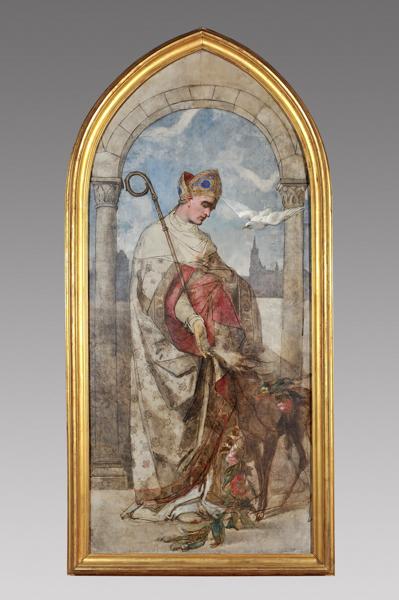 Premier évêque et patron de Senlis. 'Les premières Vies de saint Rieul ont fait de lui un évêque missionnaire, envoyé en Gaule par le pape Clément à la fin du Ier siècle de notre ère avec Denis.' Il aurait fait partie de la première mission clémentine comprenant sept évangélisateurs en Gaule (Denis à Paris). 'En résumé, saint Rieul était certainement un gallo-romain... Rieul était un confesseur et non un martyr... Il existe une première recension courte de sa vie en 850....Ces Vies nous permettent de placer l'épiscopat de Rieul après la paix d el'Eglise en 313. .. Ses fidèles l'enterrent dans l'église saint Pierre. ..Son premier miracle .. Clovis réclame une relique de l'évangélisateur de Senlis au moment de l'élévation de son corps. En arrachant une dent dans sa mâchoire, du sang jaillit....(E. Frutieaux, 'Les origines de la collégiale St Rieul de Senlis', SHAS, 1998, p. 166 et sq). Saint-Rieul est en général représenté avec un cerf ou un biche à ses pieds. Pendant qu'il célébrait sa messe à Arles (il existe aussi un évêque Rieul à Arles qui est sans doute le même que celui de Senlis selon Louis Réau, Iconographie de l'art chrétien), trois colombes blanches se perchaient sur les bras de la croix, les ailes tâchées de sang. Le Saint quitta Arles et se dirigea vers Senlis qui lui fut indiqué comme terrain évangélique. Saint-Rieul est représenté ici sous les traits de l'abbé Lemaine, curé de la cathédrale, décédé en 1867. On notera qu'à Senlis, Thomas Couture habitait rue des Pigeons-Blancs, anciennement rue des Colombes-Blanches. Cette oeuvre aurait été commandée à Couture par la Fabrique en dédommagement de son utilisation de la chapelle du chancelier Guérin comme atelier (cf. archives C. Finon). Elle était destinée à l'une des chapelles de la cathédrale.