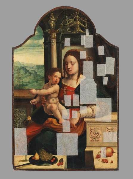 Déposée en 1896 par le musée de Cluny (inv. Cl.831), cette peinture est une réplique ancienne d'une oeuvre de Joos van Cleve, La Madone aux cerises, dont l'original n'est aujourd'hui plus connu. L'artiste anversois Joos van Cleve, oublié au fil du temps, n'a vu son oeuvre reconstituée par les historiens de l'art que dans le cours du XXe siècle en se basant sur une étude des monogrammes et des comparaisons stylistiques. Au côté de Jan Gossaert, il fait partie d'une nouvelle génération de peintres du Nord qui, tout en restant fortement marquée par l'héritage des maîtres précédents, en particulier Quentin Metsys et Joachim Patinir, assimile les influences de la Renaissance italienne. Van Cleve se signale en particulier par sa carrière internationale, au service de commanditaires génois aussi bien que des rois de France et d'Angleterre. Il existe une vingtaine de versions référencées de la Madone aux cerises, sans qu'aucune ne soit attribuée au seul maître. L'oeuvre initiale est à situer entre 1525 et 1529, alors que l'artiste cherche de plus en plus à combiner des éléments italiens et nordiques et que l'influence de Léonard de Vinci se fait particulièrement sentir dans son oeuvre. Cette composition se base en effet sur un prototype créé par ce dernier, connu au travers d'une peinture d'un de ses suiveurs lombards, Giampietrino (Dallas, Robert M. Edsel collection). La pose des personnages est identique, tandis que le paysage par la fenêtre est traité plus à la manière nordique selon les leçons de Patinir. La version d'Abbeville est intéressante car son traitement est moins léonardesque que la plupart des autres versions connues, mais plus dans la tradition du Nord. Les formes sont nettement décrites : le 'sfumato' est abandonné pour une précision du détail. Il s'agit donc d'une interprétation plus que d'une copie, qui traduit la diffusion des formes de la Renaissance dans les anciens Pays-Bas et la façon dont celles-ci sont adaptées au goût.