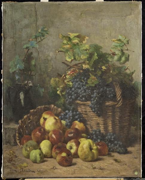 nature morte (fruit, raisin, pomme, panier, récipient, pichet)