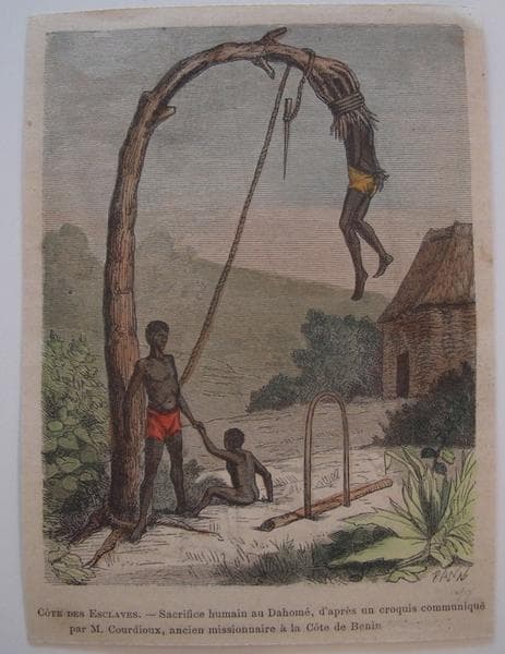 Côte des esclaves. Sacrifices humains au Dahomé, d'après un croquis communiqué par M. Courdioux, ancien missionnaire à la Côte de Bénin. (titre inscrit)
