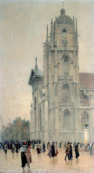 vue d'architecture (sortie, messe, foule, église, Elbeuf-sur-Seine)