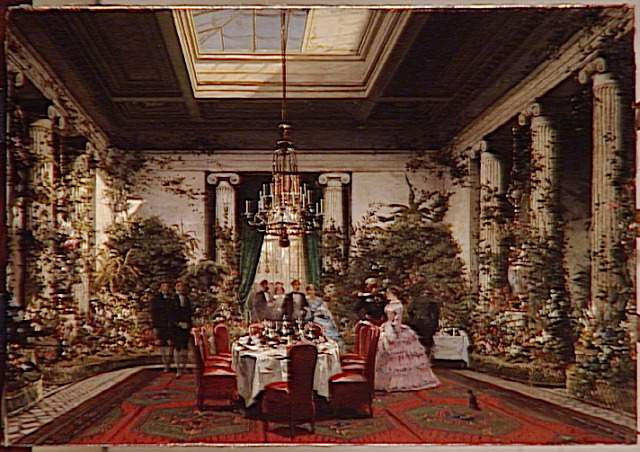 scène (princesse Mathilde, repas, réunion, homme, femme, robe, mode : époque Second Empire) ; vue d'intérieur (salle à manger, table, lustre, mobilier, plante, tapis, Paris)