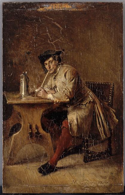 scène (homme, assis, de trois-quarts, fumeur, pipe, gobelet, vin, intérieur, époque Louis XV)