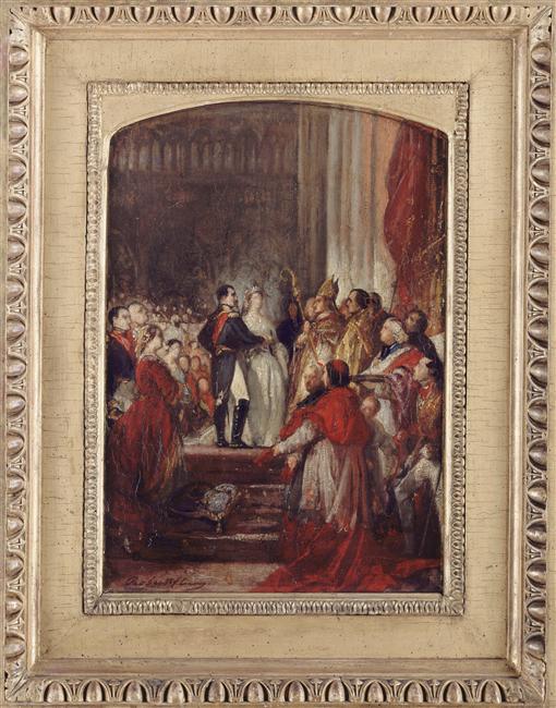 scène (mariage religieux, Napoléon III, Montijo Eugénie de, princesse Mathilde, Bonaparte Louis Napoléon Eugène Jean Joseph, prince impérial, cardinal, crosse, intérieur : Paris, cathédrale)
