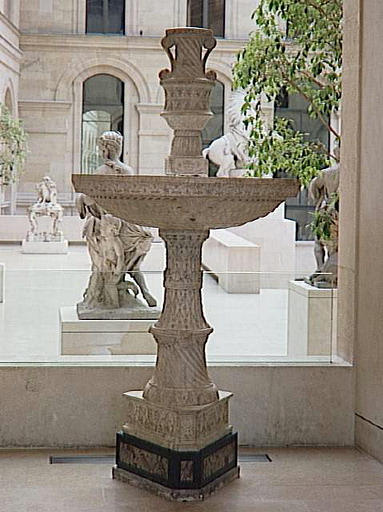 fontaine acquise par échange du marbrier Mazetti à Paris le 19 brumaire an IX (10 novembre 1800) par Alexandre Lenoir, qui indique que le monument a été sculpté à Tours par Jean Juste vers 1510 pour Anne de Bretagne ; considérée par la suite comme provenant du château de Gaillon