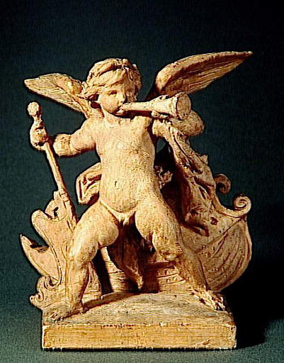 figure (allégorie : marine, enfant, nu, aile, trompe, attribut : élément de bateau, gouvernail)