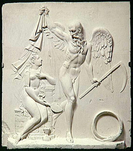 scène (allégorie : le temps, vieillard, aile, barbe, nu, voile, faux, serpent, sablier, vérité, femme, nu, assis, expression du visage : étonnement, attribut : miroir, puits)
