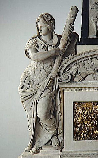 statue ayant appartenu au monument funéraire du coeur d'Henri Ier d'Orléans, duc de Longueville (1564-1593). Monument exécuté pour la chapelle des Orléans dans l'église du couvent des Célestins de Paris (disposition primitive connue par un dessin de la collection Gaignières et une gravure de l'ouvrage de Millin) après le contrat passé en 1661 (communication orale de Philip Grover); autres éléments conservés au Louvre : MR 1749 à MR 1752 (statues des vertus) ; MR 2669 à MR 2672 (reliefs des vertus) MR 3099 et MR 3100, MR 3101 A à C (obélisque et piédestal) ; MR 3373, MR 3374 (reliefs historiques)