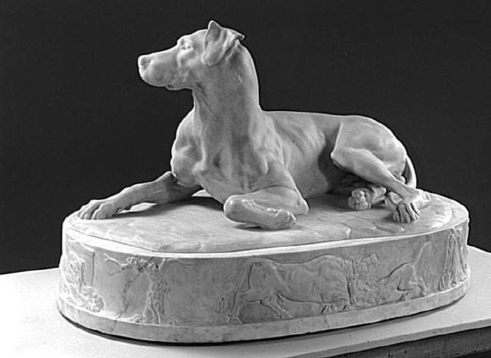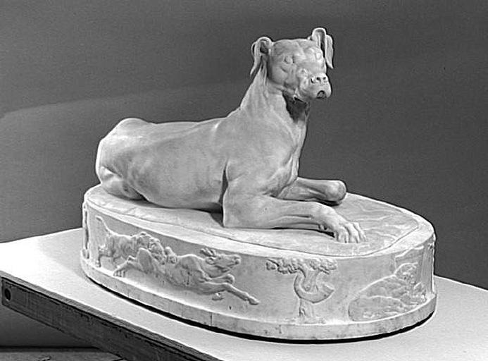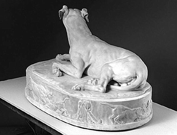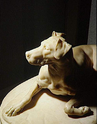 plinthe ornée de bas-reliefs illustrant les qualités du chien : Fidélité, Courage, Vigilance et Agilité ; le modèle fut exécuté à Rome ; le marbre fut acquis par le ministère de la Maison du roi le 29 mai 1828 ; un exemplaire en plâtre est conservé au musée de Toul ; il existe des réductions en bronze dont une est déposée au musée de Riom (RF 389)