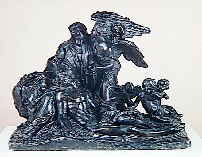 procès-verbal de l'Académie, t.III dit : Christ descendu de la Croix, soutenu sur un des genoux de la Vierge, avec trois Anges à costé ; description de l'Académie : Piétà ; Muséum central des arts : Descente de Croix