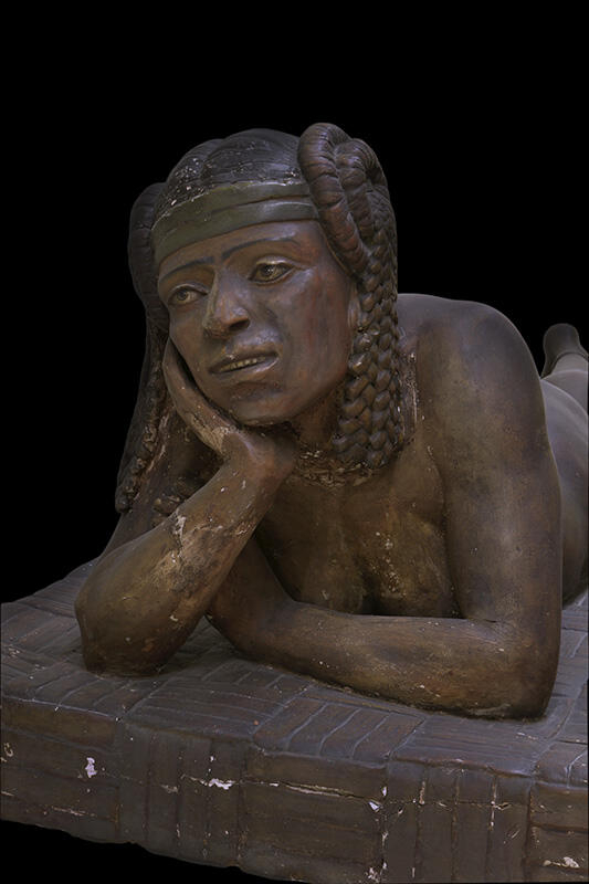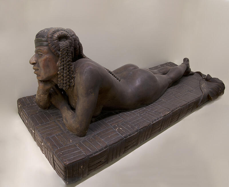 femme nue allongée sur le ventre, les jambes croisées. cheveux tressés et roulés. menton posé dans le creux de la main droite. regard en l'air. socle rectangulaire représentant un matelas formé de bandes entrecroisées régulièrement