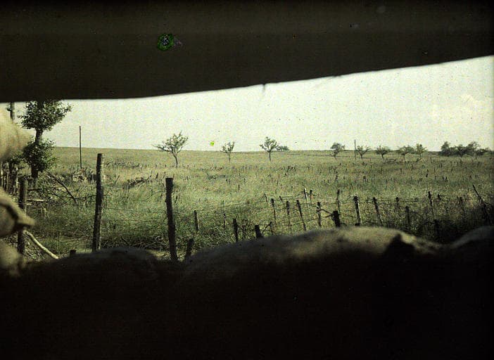 POP | Plateforme ouverte du patrimoineTranchée de première ligne, poste d'observation : vue sur un champ couvert de barbelés ; Au premier plan, sac de sable