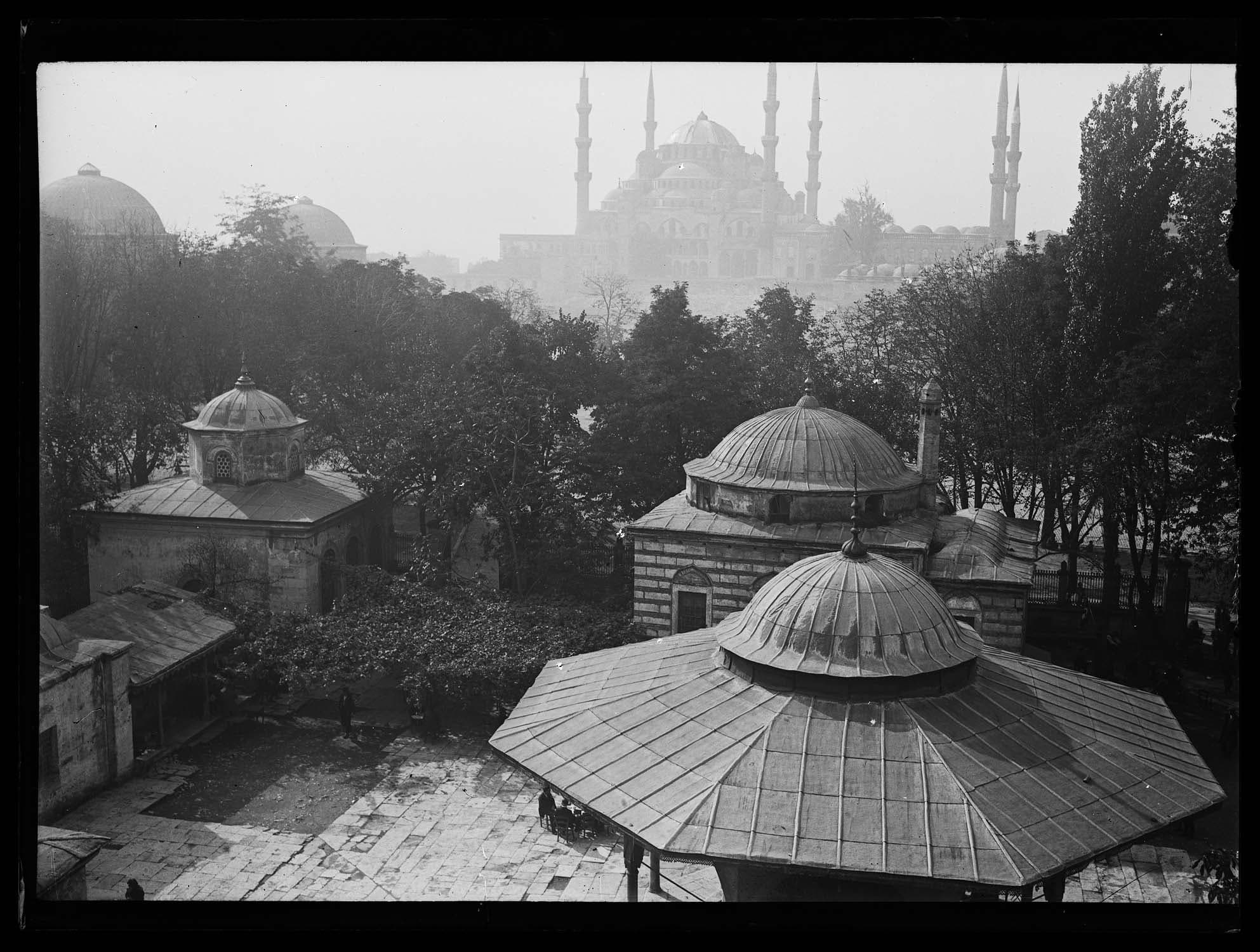 POP | Plateforme ouverte du patrimoineJardin et toits des mausolées au sud de Sainte-Sophie avec vue sur la façade nord de la Mosquée bleue en arrière-plan