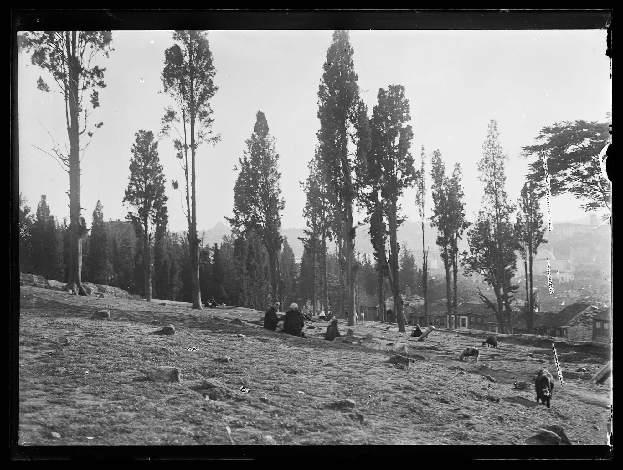 POP | Plateforme ouverte du patrimoineScène de vie quotidienne : moutons et habitants du quartier dans un pré planté d'arbres