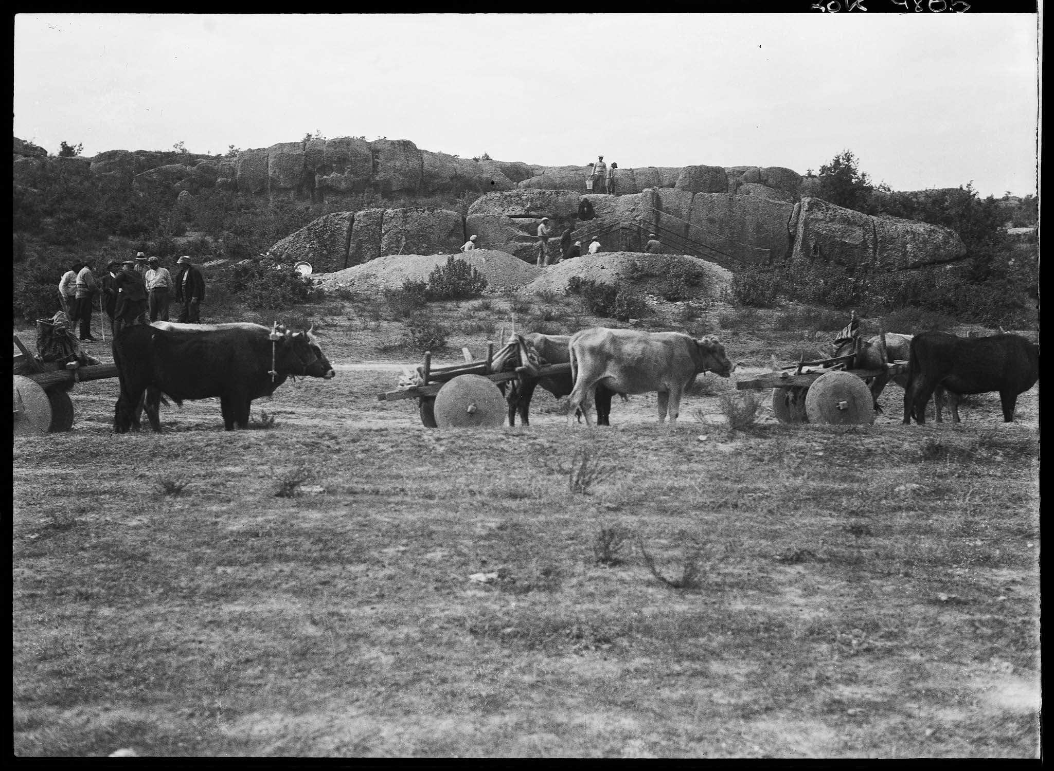 Attelages de bœufs devant le site archéologique
