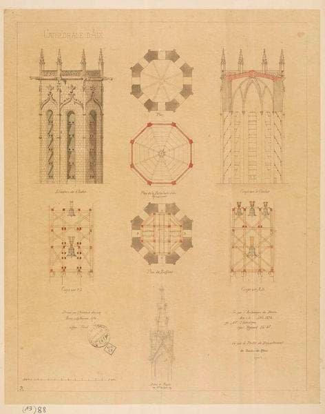 Projet de beffroi. Plan du clocher. Plan du beffroi. Plan de la balustrade et de la couverture du clocher. Élévation du clocher. Coupe sur le clocher. Deux coupes sur le beffroi. Détail des pinacles