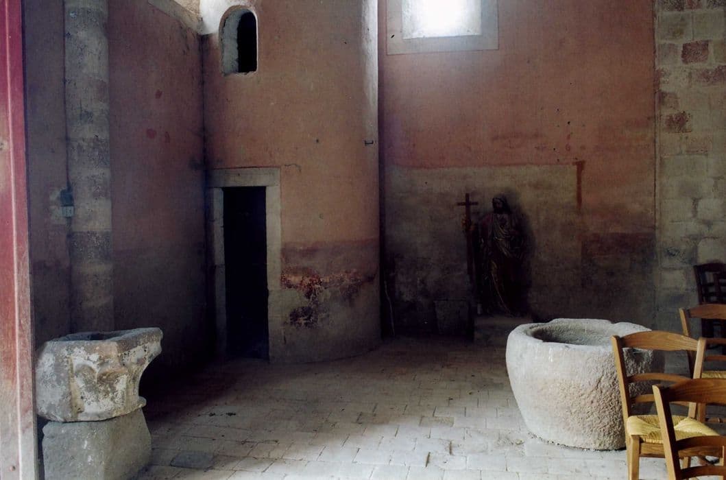 cuve baptismale, chapiteau transformé en bénitier