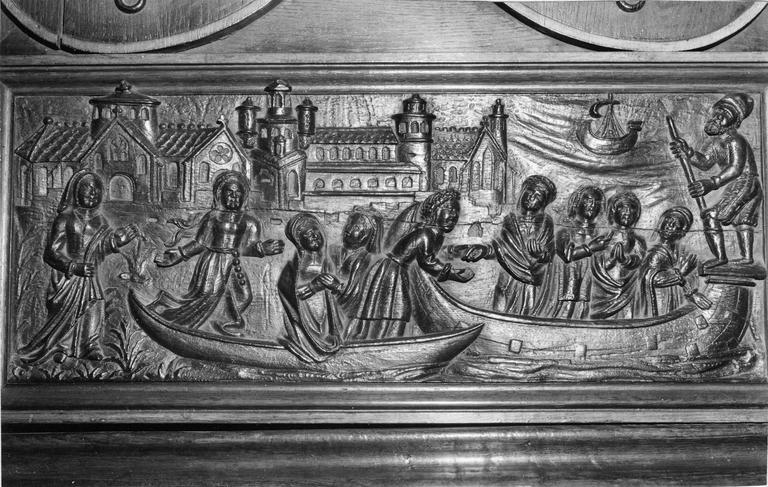 confessionnal, bois sculpté, 16e siècle, détail d'une scène de passage d'un fleuve sculptée sur un panneau de bois