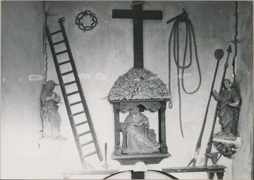 groupe sculpté : Vierge de Pitié, deux statues de poutre de gloire : Vierge et Saint Jean, et instruments de la Passion