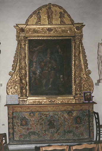 Autel, retable, tableau : 'Saint Quinis', retable architecturé à fronton sculpté en bas-relief d'une effigie du saint et de deux anges, autel peint d'angelots tenant des armoiries