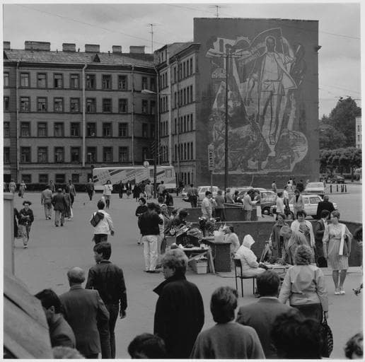 Scène de rue, vente de fleurs sur une place entourée d'une fresque de propagande soviétique