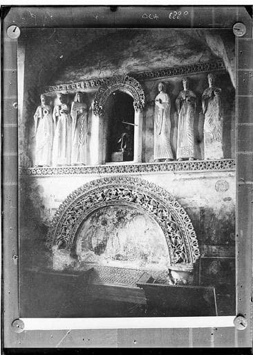Frise ; Haut-relief ; Personnage religieux ; Femme ; Baie ; Ornement végétal ; Raisin ; Peinture murale