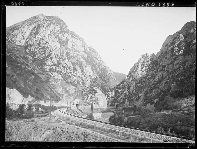 Vallée de l'Aude : défilé de Pierre-Lys. Entrée du défilé vers l'amont. Chemin de fer