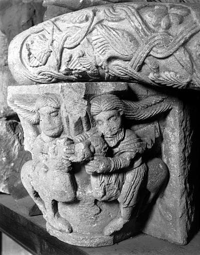 Deux chapiteaux déposés : hommes chevauchant des animaux, oiseaux dans des entrelacs