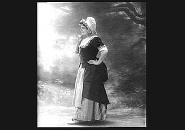 ACTRICE ; EN PIED ; VUE DE PROFIL ; COSTUME DE SCENE ; TOILE DE FOND