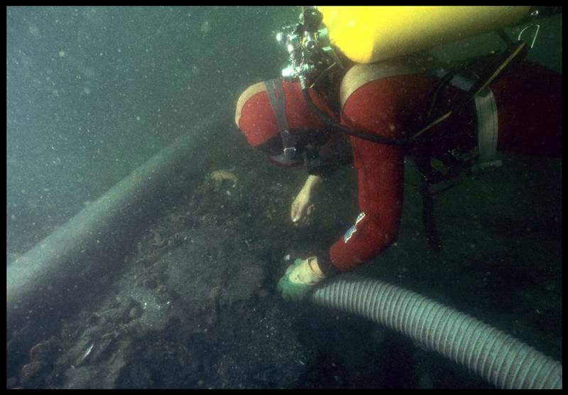 Vue sous-marine d'un plongeur dévasant à la suceuse à eau (fouille M. L'Hour/Drassm, E. Veyrat/Drassm).