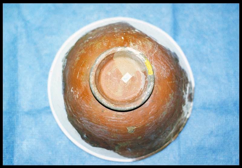 Vue de la restauration visible d'une céramique sigillée (CNRAS).