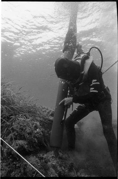 Vue sous-marine d'un plongeur entamant le mur de fouille à la suceuse à air(fouille L. Long/Drassm).