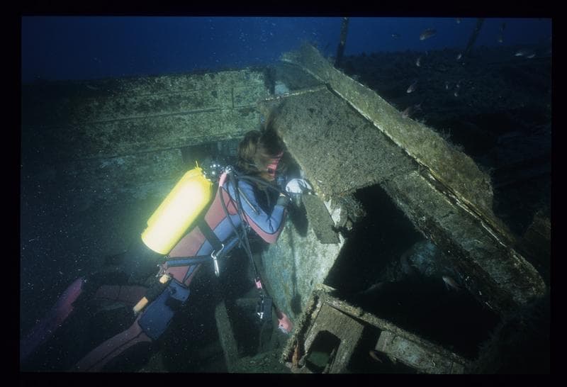 Vue sous-marine d'un plongeur visitant la carène de bois.