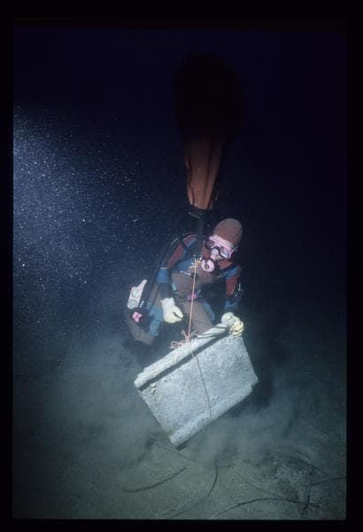Vue sous-marine d'un plongeur effectuant le levage au ballon une tuile plate (fouille A. Joncheray-Lopez).