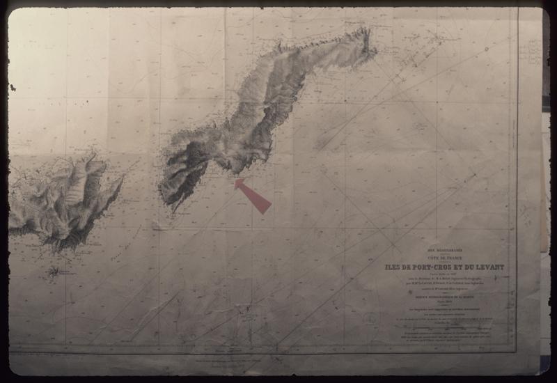 POP | Plateforme ouverte du patrimoineVue de la localisation de l'épave sur la carte de l'île du Levant (fouille M. Guérout).