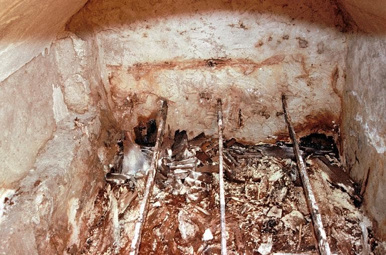 Vue rapprochée du caveau contenant des ossements et des débris de vaisselle au rez-de-chaussée du clocher de l'église paroissiale Saint-Martin, situé sous une dalle après l'entrée du clocher. La disposition des grilles destinées à supporter les cercueils laisse supposer qu'il s'agit d'une construction des XVII-XVIIIème s. (Eglise Saint-Martin, Saint-Rémy-de-Provence, Bouches-du-Rhône).