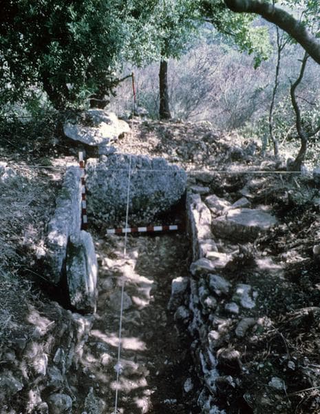 Vue générale du dolmen de Pomereit prise en 1970 au début des fouilles de Gérard Sauzade qui a achevé l'exploration entreprise par Casimir Bottin à la fin du XIXe s. Il est composé d'une chambre rectangulaire et d'un couloir à l'ouest avec dalles et murets de pierres sèches. La première exploration a livré une cinquantaine d'individus et du mobilier. La dernière a permis d'isoler deux périodes d'utilisation : une chalcolithique suivi d'une réutilisation au Bronze ancien (Cabris, Alpes-Maritimes).