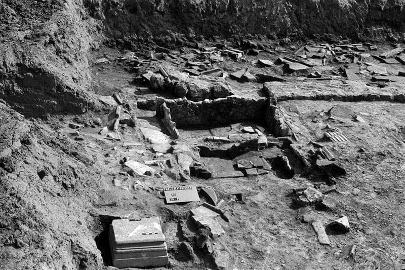 Vue générale du bâtiment avec traces d'éléments luxueux : fragments de plaques en marbre, base moulurée en marbre blanc découverte sous le niveau de destruction (fouille sous la direction de Christian Goudineau) (Les Aiguières, Fréjus, Var).