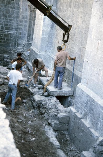 Zone 2, troisième travée, caveaux extérieurs, transfert de la dalle de couverture du caveau 1052, fouille de sauvetage programmé dans la cathédrale Notre-Dame-du-Bourg en 1987 (Digne-les-Bains, Alpes-de-Haute-Provence).