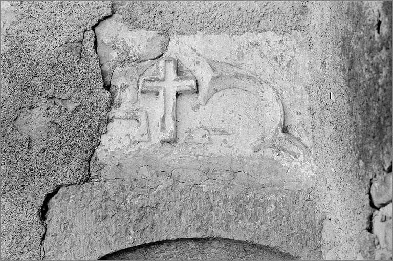 Ferme, élévation antérieure, porte piétonne détail : linteau trilobé, croix et outils de charpentier, ensemble face.