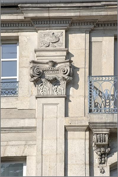 Corps principal (A) : façade antérieure sur rue, détail de la travée centrale (3e niveau) et du décor de pilastre (côté gauche).