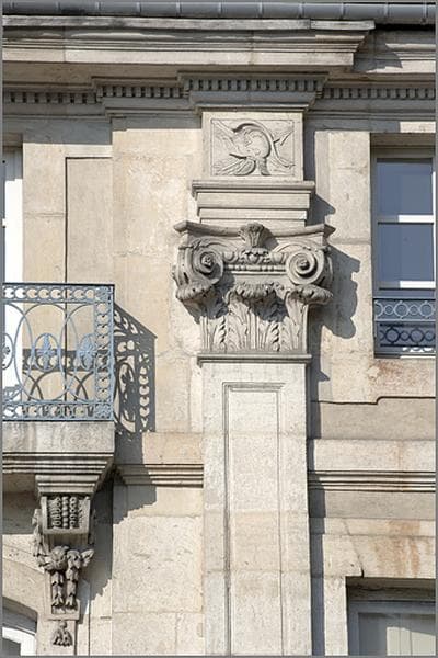 Corps principal (A) : façade antérieure sur rue, détail de la travée centrale (3e niveau) et du décor de pilastre (côté droit).
