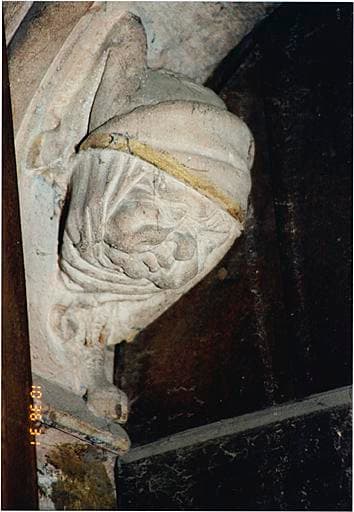 Porte donnant accès depuis le cloître au bras nord du transept. Vue du coussinet, côté gauche, avec tête d'homme (depuis le transept).